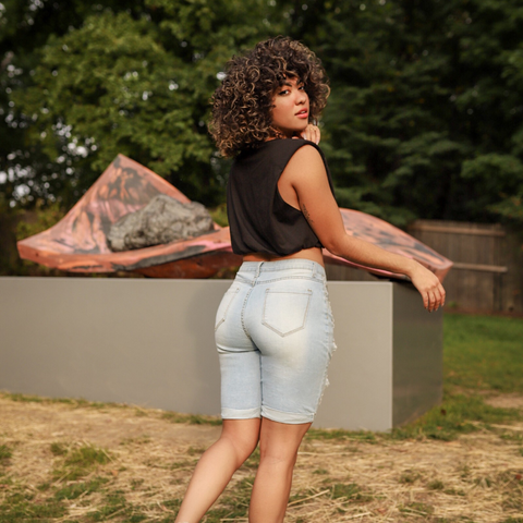 You will look so cute and sexy with these destroyed mid rise stretchy bermuda short Jeans.