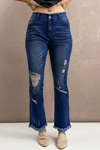 Best9:BLUE FRAYED RIPPED HIGH WAIST FLARE JEANS